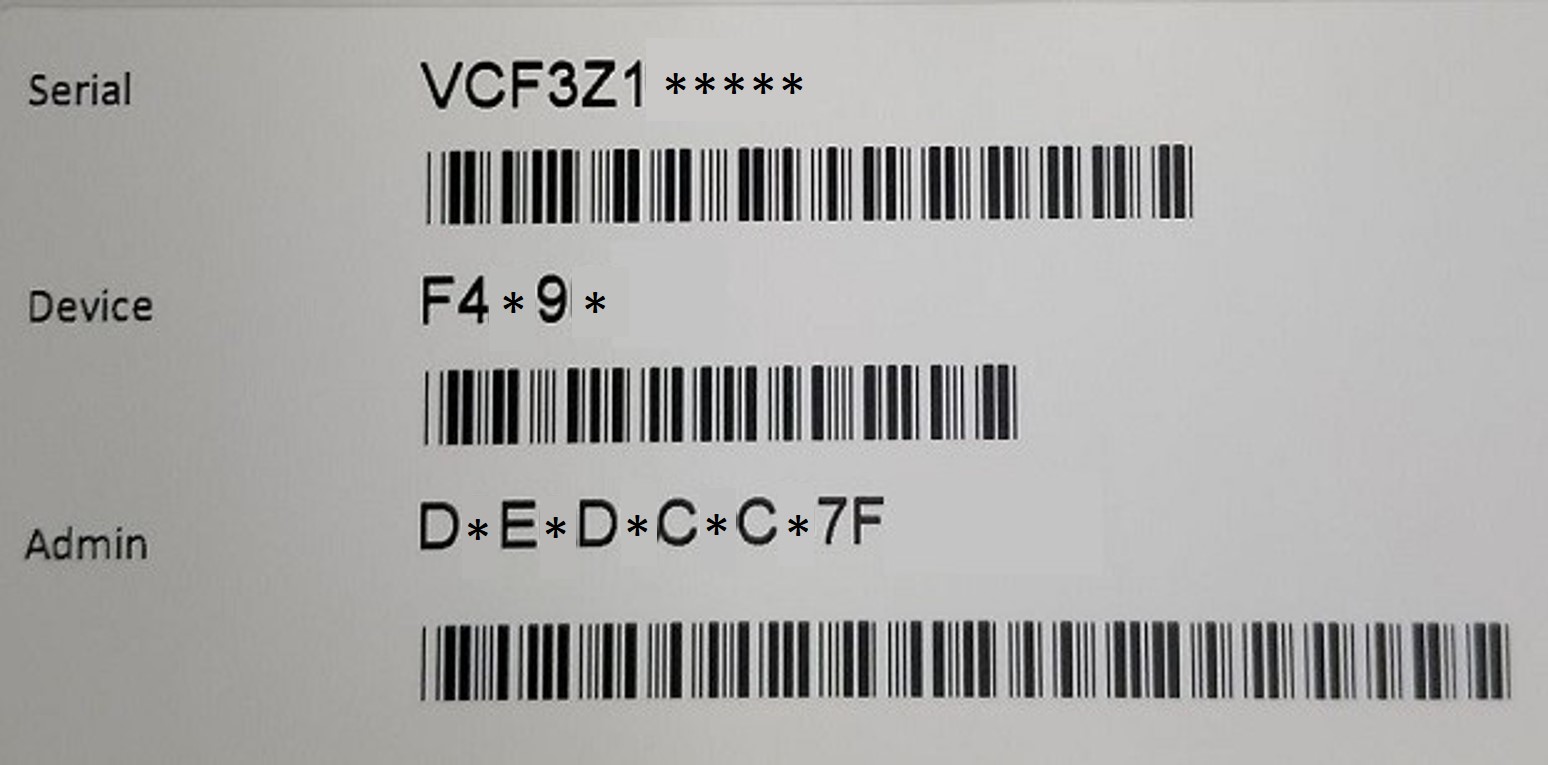 В наборе сопроводительный документов каждого устройства, вместе с пользовательской инструкцией по технике безопасности и инсталяционным диском, находится этикетка размером 8х4 см, на которой размещена информация о серийном номере устройства и пароль индивидуального доступа в ADMIN (см. фото), которая должна быть приклеена на аппарат непосредственно самим пользователем.