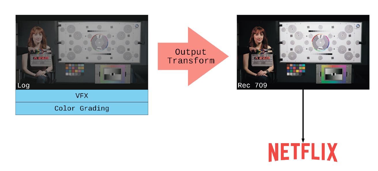 Выходное преобразование конвертирует рабочее цветовое пространство в цветовое пространство дисплея, проектора и т. п. Использование выходного преобразования (или просмотрового LUT-а, например, созданного колористом или лабораторией, или даже обычного LUT-а ARRI 709) может быть полезно не только для формирования представления о цветовом решении проекта, но и дает понимание ширины динамического диапазона, в рамках которого может работать колорист или художник компьютерной графики.