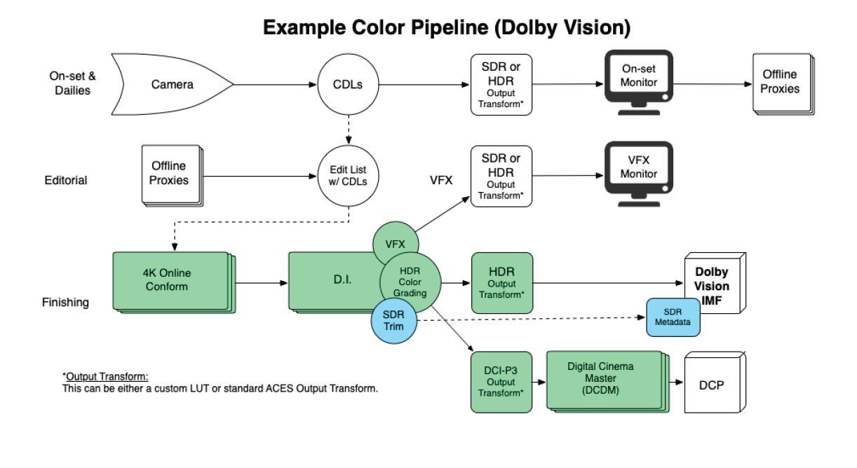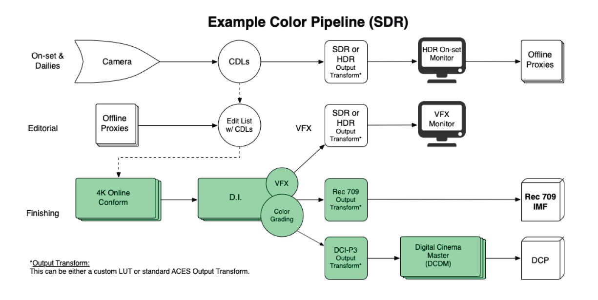 Как уже упоминалось ранее, важно, чтобы съемочный материал хранился в формате с максимально широким цветовым пространством до самого конца цветокоррекции. Это легко реализуемо в ACES, где манипуляции с изображением производятся в широком динамическом диапазоне и цветовой гамме, а для просмотра на дисплее достаточно только подключить выходное преобразование. Также этого можно достичь, работая в исходном цветовом пространстве камеры, но с очень четким контролем конвертации и мониторных LUT-ов. На приведенной ниже схеме показана технология управления цветом на съемочной площадке, на этапе монтажа и на постпродакшене.